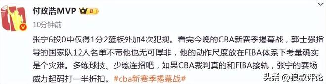 媒体人付政浩发文点评:“张宁6投0中仅得1分2篮板外加4次犯规。看完今晚的CBA新赛季揭幕战,郭士强指导的国家队12人名单不带他也无可厚非,他的动作尺度放在FIBA体系下考量确实是个灾难。多练球技、少练连招吧,如果CBA裁判真的和FIBA接轨,张宁的赛场威力起码打一半折扣。”